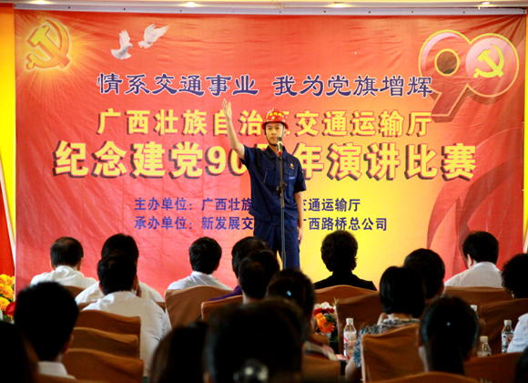 6月10日上午,由集團(tuán)公司承辦的全區(qū)交通運(yùn)輸系統(tǒng)慶祝建黨90周年“情系交通事業(yè),我為黨旗增輝”演講比賽在南寧舉行。自治區(qū)交通運(yùn)輸廳副廳長(zhǎng)梁毅、副巡視員黃小幸、廳長(zhǎng)助理劉昕等領(lǐng)導(dǎo),廳直屬單位的領(lǐng)導(dǎo)及觀眾共350人到現(xiàn)場(chǎng)觀看比賽。自治區(qū)直屬企事業(yè)工會(huì)副主任陳元滾、自治區(qū)直屬機(jī)關(guān)工委組織部部長(zhǎng)李祖循等領(lǐng)導(dǎo)應(yīng)邀參加。來自廳直屬單位共23位選手參加了此次比賽。