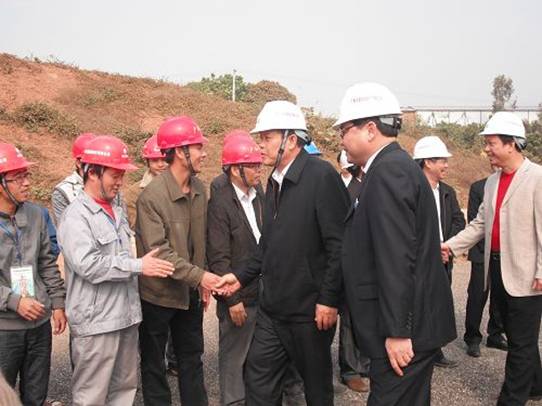 當(dāng)天,楊道喜副主席來(lái)到玉鐵5標(biāo)K56+365.291沙田互通建設(shè)現(xiàn)場(chǎng),當(dāng)看到著裝整齊、精神抖擻的廣西路橋員工隊(duì)伍,感受到大干旱季、沖刺收尾階段的熱烈氣氛時(shí),楊副主席上前與項(xiàng)目員工一一握手并親切問(wèn)候到:“廣西路橋的員工,你們辛苦了”。他鼓勵(lì)廣西路橋建設(shè)者要做好廣西交通基礎(chǔ)設(shè)施建設(shè)的排頭兵,在確保質(zhì)量、安全的前提下,克難攻堅(jiān),全力推進(jìn)工程建設(shè)進(jìn)度,堅(jiān)持年底完成全線主體工程的目標(biāo)不動(dòng)搖,為玉鐵高速公路的建設(shè)做出積極貢獻(xiàn),為推動(dòng)廣西經(jīng)濟(jì)社會(huì)又好又快發(fā)展做出新的更大貢獻(xiàn)。