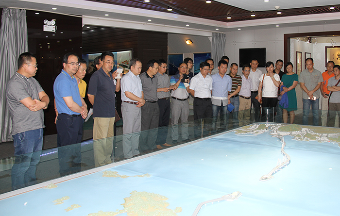 在港珠澳大橋管理局展廳,管理局蘇權(quán)科總工程師向考察團介紹了港珠澳大橋建設(shè)背景、工程概況、技術(shù)難點、工程進(jìn)展等情況。集團公司學(xué)習(xí)考察人員就工程建設(shè)管理模式、防災(zāi)減災(zāi)設(shè)計、耐久性設(shè)計、沉管對接方案、人工島筑島工藝等問題與大橋項目管理人員進(jìn)行了探討交流。