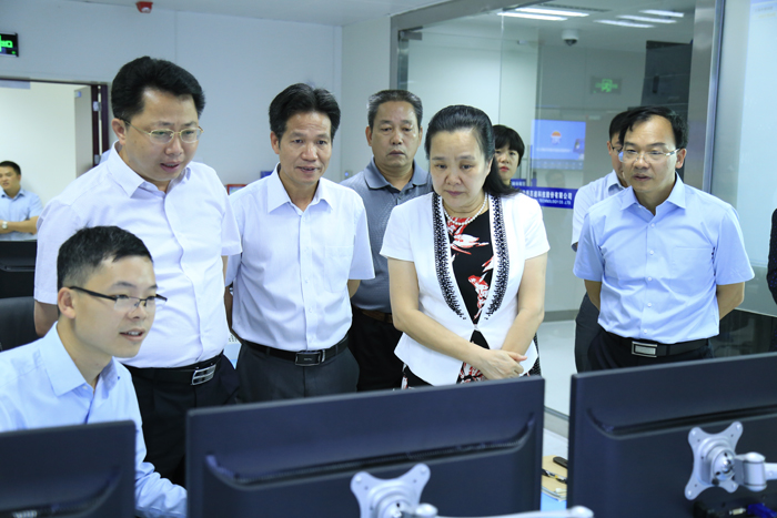 黃敏(前右二)一行在廣西ETC數(shù)據(jù)中心機房調(diào)研,朱堅和(左二)、張友坐(左四)、鄧遠志(右一)陪同。