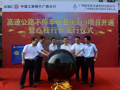 8月25日上午,中國(guó)工商銀行廣西分行與集團(tuán)公司舉行高速公路不停車收費(fèi)(ETC)項(xiàng)目開通暨八桂行卡發(fā)行儀式,標(biāo)志著工行ETC業(yè)務(wù)在廣西正式啟動(dòng)。集團(tuán)公司董事、副總經(jīng)理劉明洪,工行廣西區(qū)分行副行長(zhǎng)楊永等領(lǐng)導(dǎo)出席儀式并致辭。
