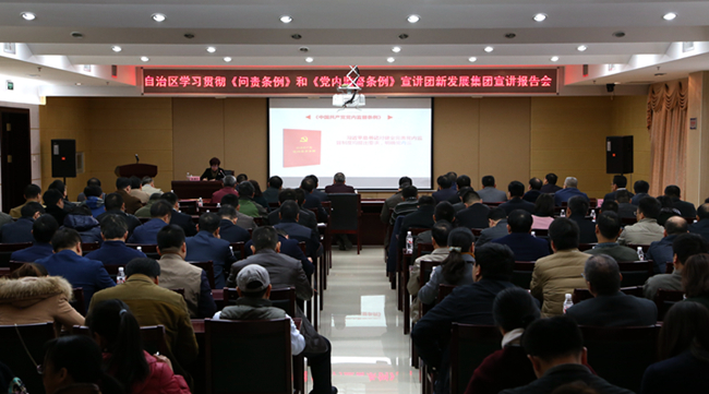 2017年2月24日上午,自治區(qū)學(xué)習(xí)貫徹《中國共產(chǎn)黨問責條例》《中國共產(chǎn)黨黨內(nèi)監(jiān)督條例》宣講團到集團公司舉行宣講報告會,自治區(qū)紀委宣傳部部長陳柳青作宣講報告,集團公司黨委副書記、副董事長、總經(jīng)理唐咸秋主持會議。
