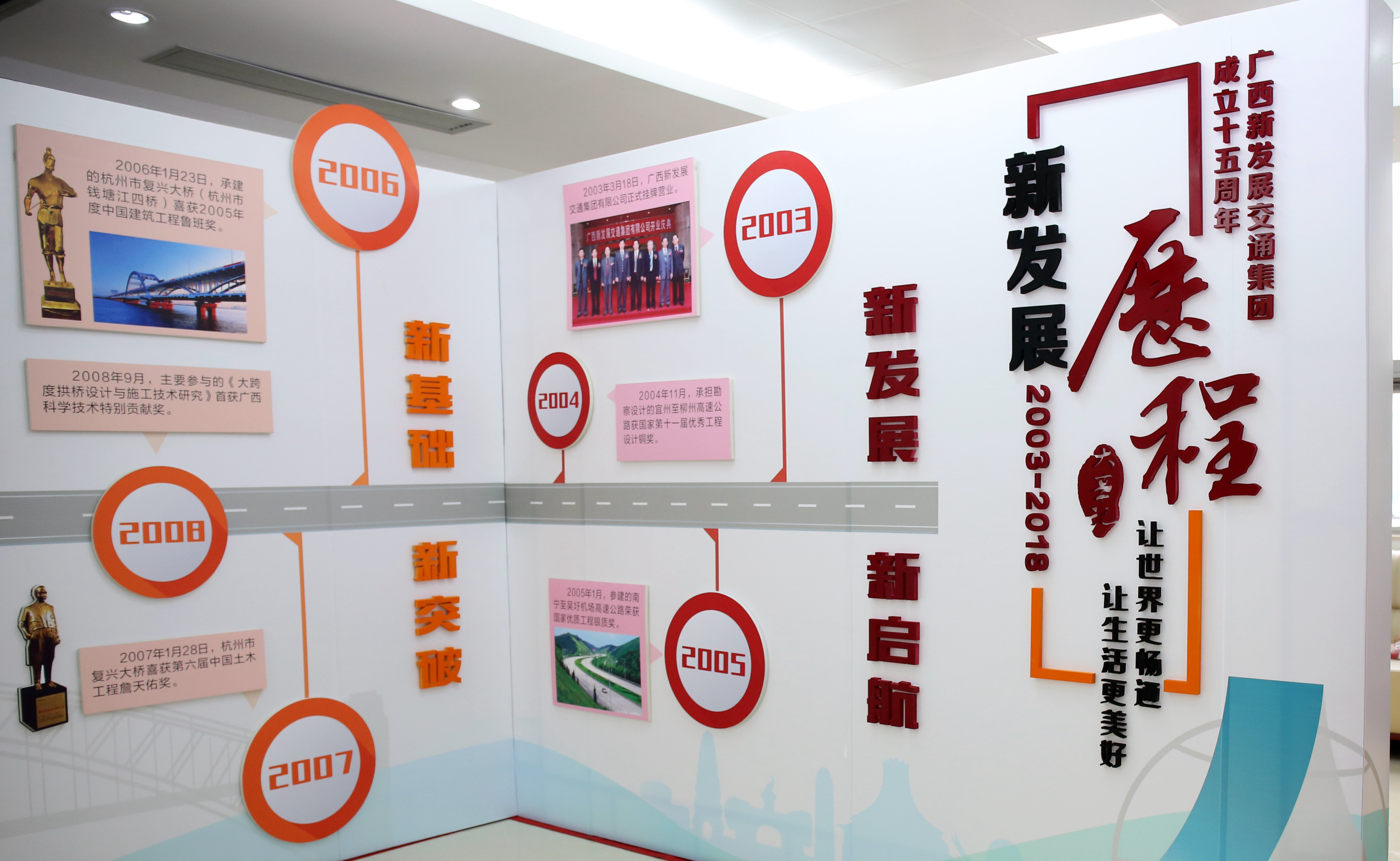 在活動現(xiàn)場入口處,設(shè)置有一面企業(yè)發(fā)展歷程墻,展示了歷年來集團公司發(fā)展取得的矚目成績?;顒娱_始后首先播放了《新時代 新發(fā)展 新征程》——廣西新發(fā)展交通集團15周年紀(jì)錄片,對15年發(fā)展史進行了有聲有色的回顧。