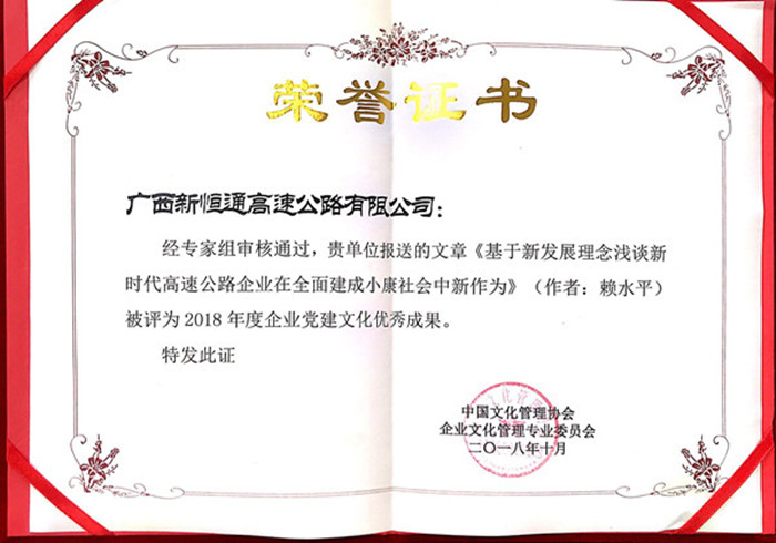 會(huì)上,由賴(lài)水平撰寫(xiě)的文章《基于新發(fā)展理念淺談新時(shí)代高速公路企業(yè)在全面建成小康社會(huì)中新作為》在企業(yè)黨建文化優(yōu)秀成果評(píng)比中,被評(píng)為2018年度企業(yè)黨建文化優(yōu)秀成果;由新恒通公司都巴指揮部創(chuàng)作團(tuán)隊(duì)拍攝的《遷動(dòng)人心》微電影榮獲“最美企業(yè)之聲”代言作品榮譽(yù)稱(chēng)號(hào)。