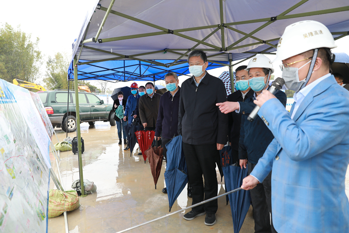 自治區(qū)副主席費志榮(右四)到吳隆路施工現(xiàn)場調(diào)研交通項目復(fù)工建設(shè)情況