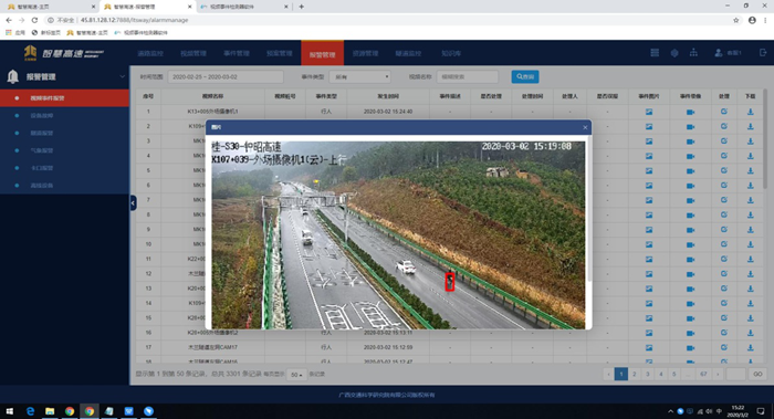 近日,昭平運(yùn)營管理中心智慧高速軟件平臺引入了“人工智能事件檢測報警系統(tǒng)”。該系統(tǒng)采用了人工智能深度學(xué)習(xí)技術(shù),在鐘昭高速每2公里一個監(jiān)控?cái)z像機(jī)的硬件基礎(chǔ)上,能夠?qū)崿F(xiàn)鐘昭高速全線事件檢測全面覆蓋,快速發(fā)現(xiàn)路上異常情況并發(fā)出警報。
